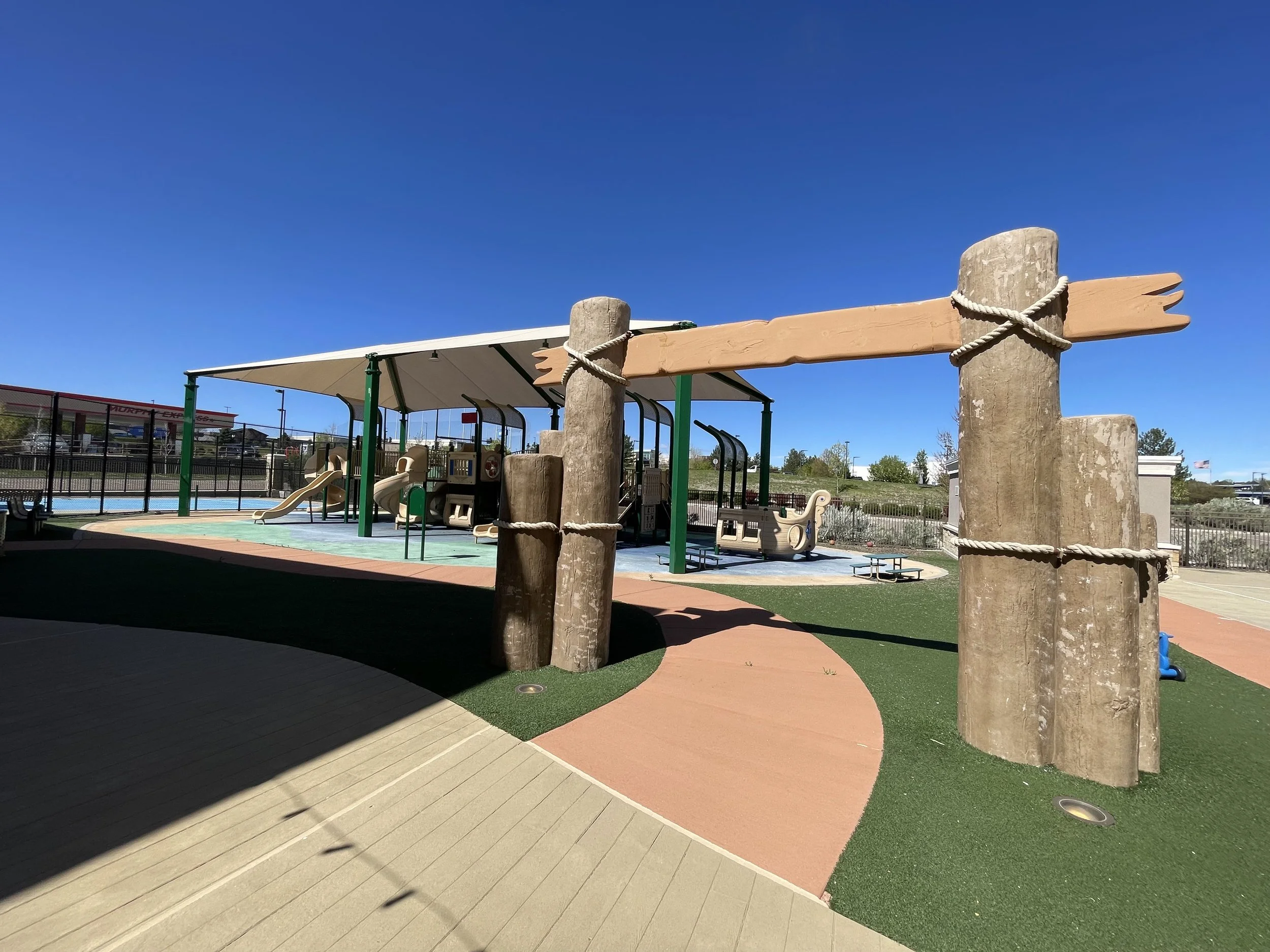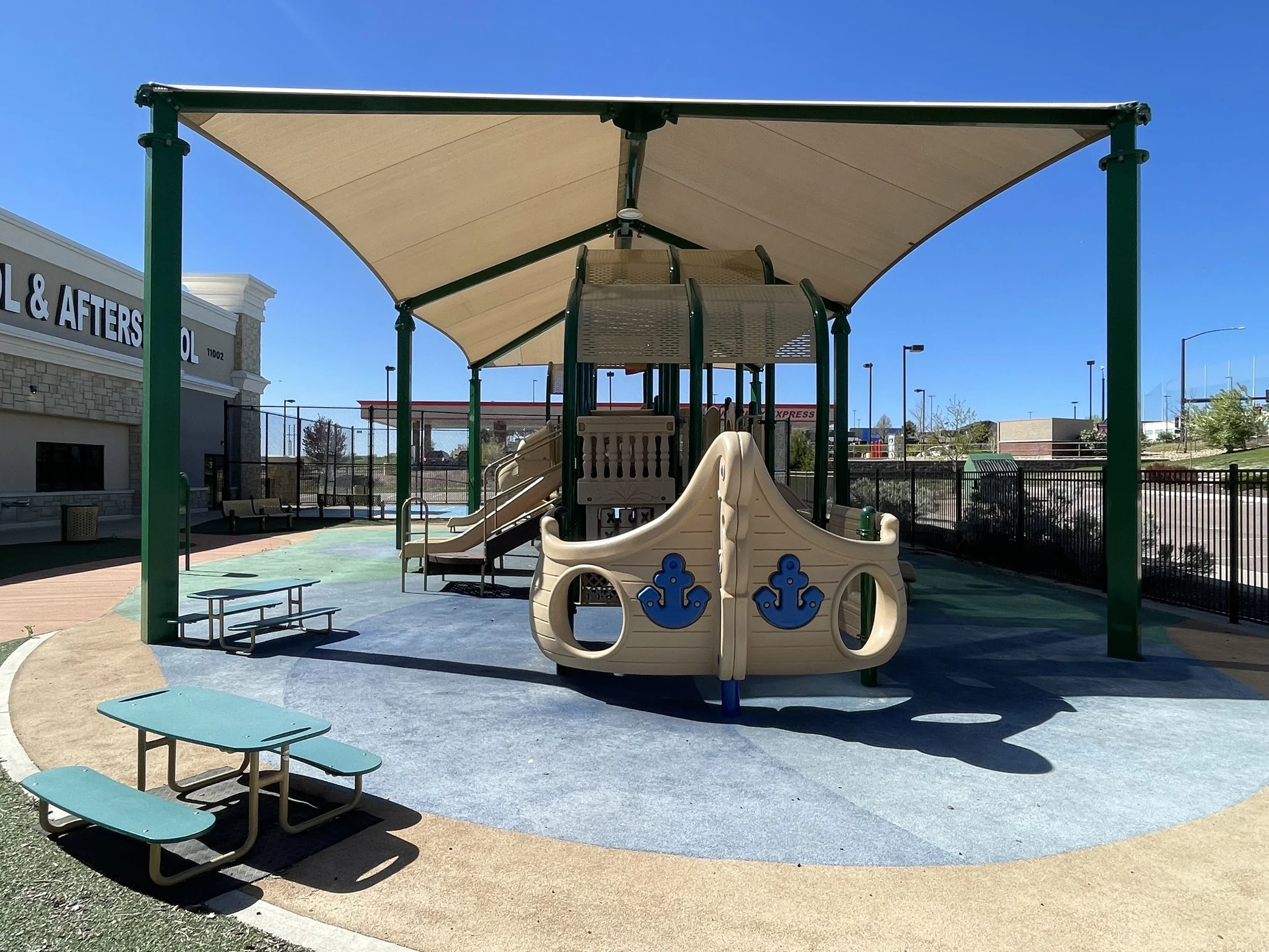 The playground is built for maximum safety and comfort, incorporated in all playground equipment and pour-in-place 6 inch-rubber cushioned playground flooring. Shaded and lit canopies provide protection from hot Colorado sun and weather year around.